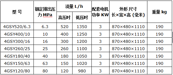 上???yáng)泵業(yè)生產(chǎn)的4GSY型四缸大流量系列電動(dòng)試壓泵主要型號(hào)參數(shù)如下: