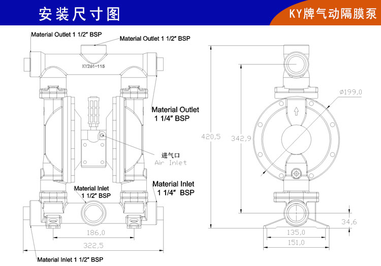KY261-115不銹鋼氣動隔膜泵是上??柋脴I(yè)不斷吸取和學習進口高端氣動隔膜泵的經(jīng)驗研發(fā)成功的最新型國產(chǎn)KY氣動隔膜泵。在泵體和配氣裝置都有革命性的改進,具有無死點、效率高、流量大等特點。廣泛應用于制藥、污水處理、食品、化工、汽車、涂料等行業(yè)。水泵的材質(zhì)有鑄鐵、不銹鋼304氣動隔膜泵、不銹鋼316L氣動隔膜泵等,隔膜片選用高壓復合特氟龍材質(zhì),密封座采用不銹鋼材質(zhì)。KY不銹鋼氣動隔膜泵自吸能力干吸可以達到5米,濕吸8米,在工作壓力8公斤時還可以保證足夠流量輸出。壓濾機板框正常工作需要7公斤左右的壓力才可以正常出泥餅,一般不銹鋼氣動隔膜泵達到7公斤壓力時容易有流量低、效率下降等問題,這時更體現(xiàn)了KY261壓濾機隔膜泵的優(yōu)勢。因為KY261不銹鋼氣動隔膜泵的特點就是壓力足,在高壓時可以有更大流量,所以大家都稱它是壓濾機隔膜泵。