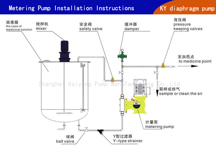 三、計量加藥泵的排液端裝有截止閥時,如果關(guān)閉截止閥,電磁隔膜計量泵運行產(chǎn)生的背壓可能是最大允背壓的幾倍,由此可能導(dǎo)致排液管線破裂,為了防止這種情況的發(fā)生,建議選用一個溢流閥將最大背壓限制在允許值以內(nèi)。