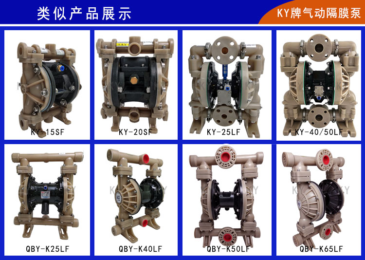 8)KY20SF氟塑料氣動隔膜泵氣動隔膜泵不僅流量和壓力都有大幅度提升,噪音也有明顯減小,因為KY型氣動隔膜泵全部采用逆滲透濾芯,真正做到降音無阻力的作用。