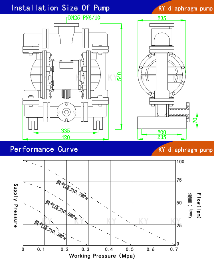 2)QBY-K25LC氣動(dòng)隔膜泵進(jìn)出口管道采用三節(jié)連接,中間進(jìn)出口管道可以360度旋轉(zhuǎn),方便使用安裝。