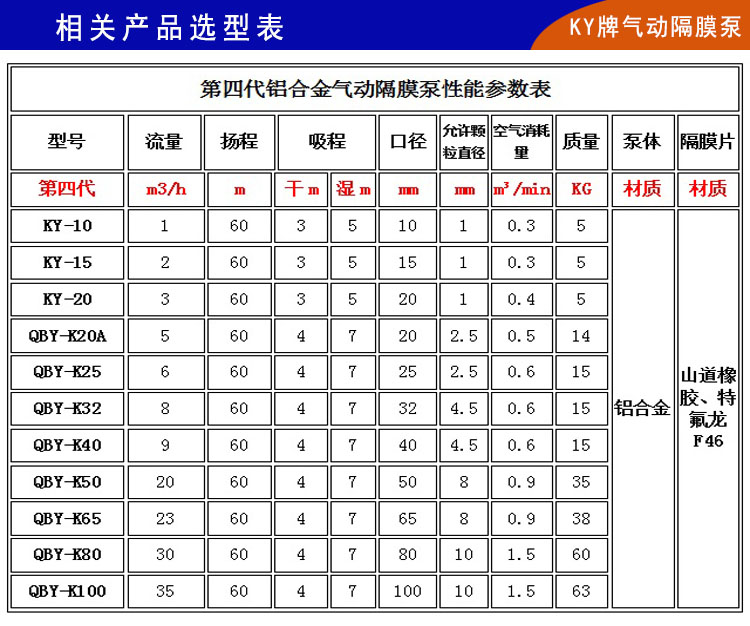 1)、楷陽泵業(yè)專業(yè)生產(chǎn)隔膜泵,QBYK65LL氣動(dòng)隔膜泵鑄件全部數(shù)控加工,主膜片采用特氟龍F(tuán)46和進(jìn)口特氟龍,副膜片使用山道橡膠和彈性橡膠,替代了國(guó)產(chǎn)常用的四氟和丁晴橡膠等劣質(zhì)易損件;密封球和密封座采用特氟龍F(tuán)4和山道橡膠;從而大大增加了氣動(dòng)隔膜泵易損件的使用壽命。