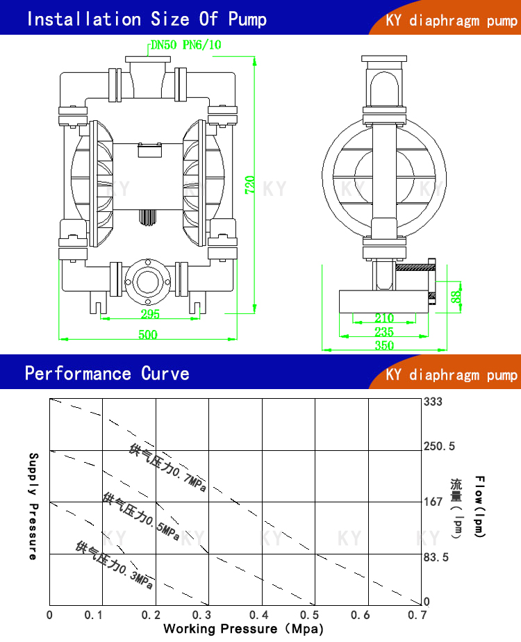 7、第四代qby氣動(dòng)隔膜泵不需灌引水,吸程高達(dá)7米,揚(yáng)程達(dá)70米,出口壓力≧7bar;通過性能好,允許通過最大顆粒直徑達(dá)10毫米。